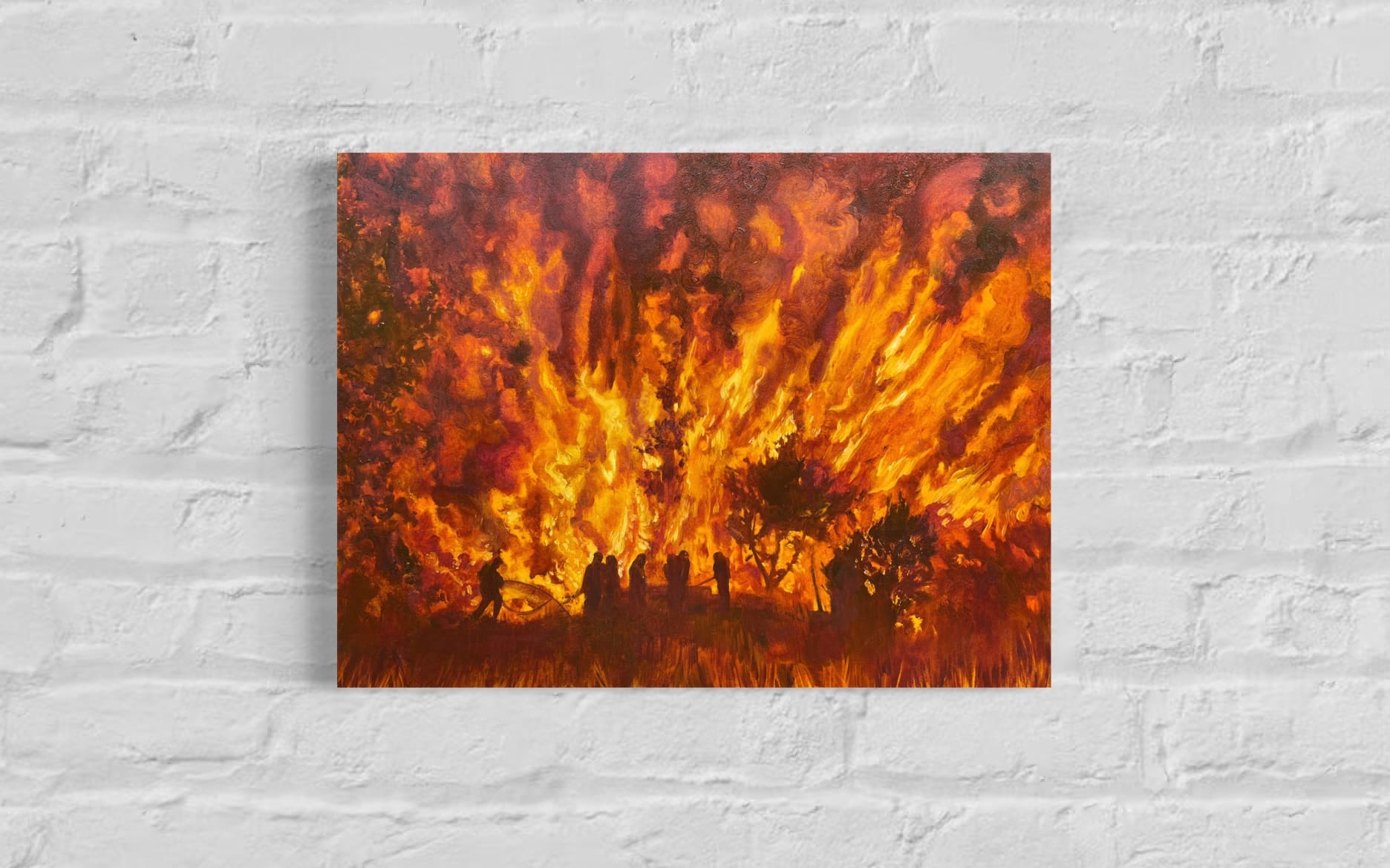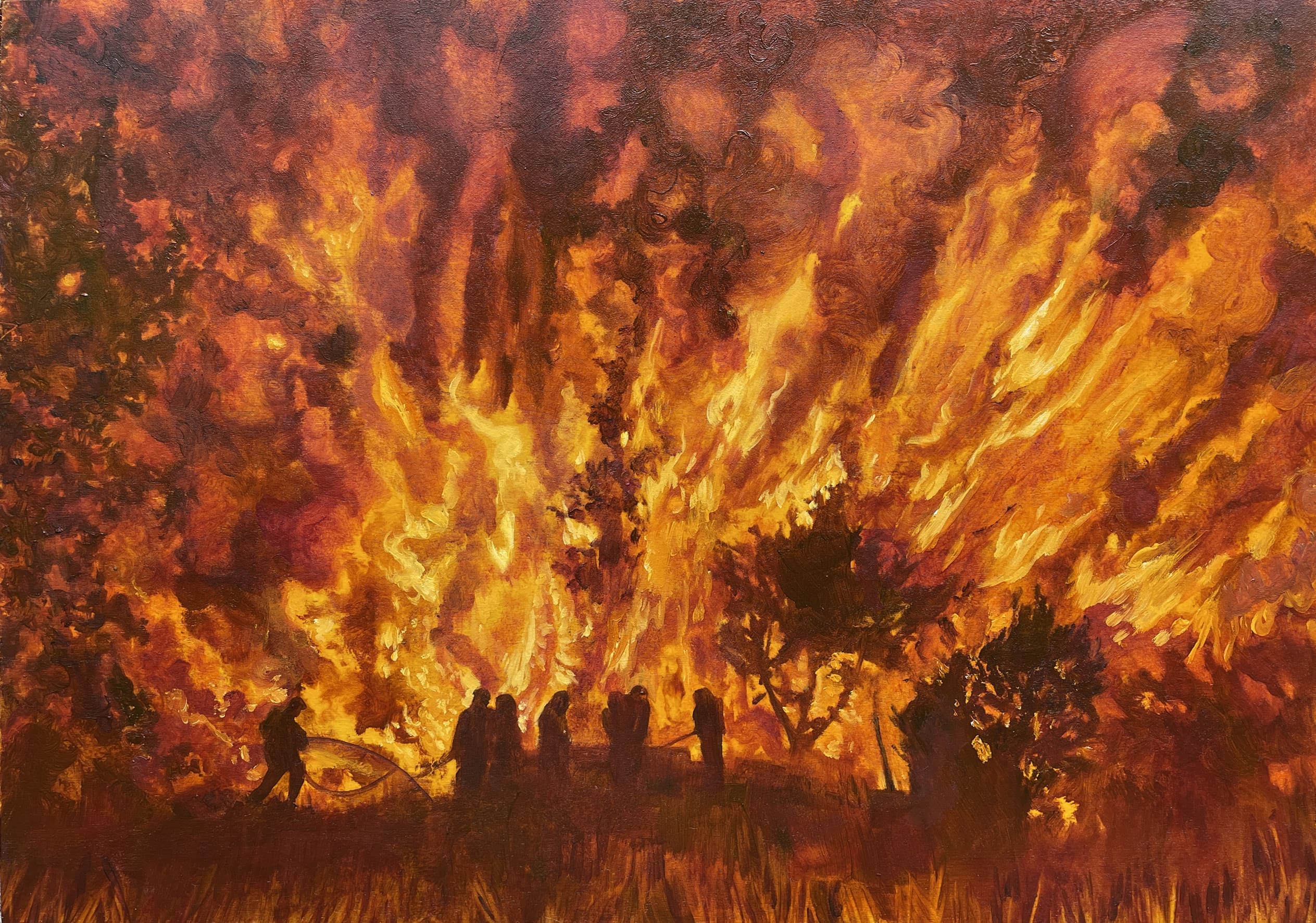 Painted in 2022 as part of a project recording reportage images of climate change. Making work from photos or film entails a process of taking in the power of an image and its importance in the story of climate, but also whether it adds to the project as a whole. Painting from images is a balancing act pf representing what is there but also using paint to express something deeper. The source image is often discarded after a short while to allow the act of painting to dictate.