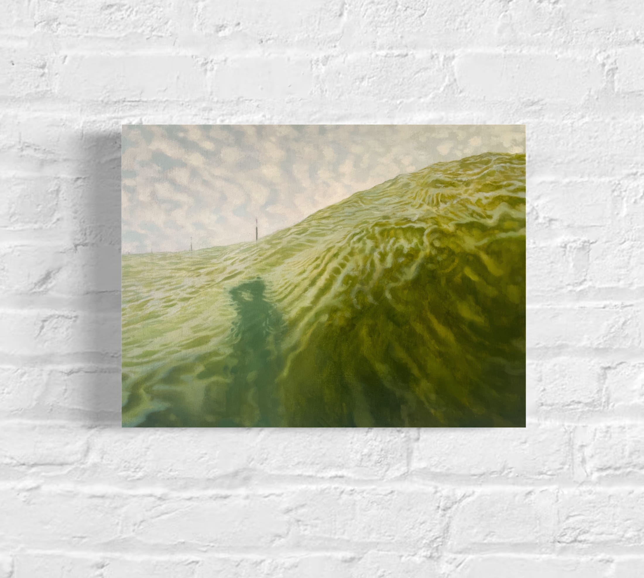 A painting depicting a distorted shadow selfie upon a wave, taking a photo. Painted with oil on a braced birch wood panel, with deep 5cm bare wood edges.