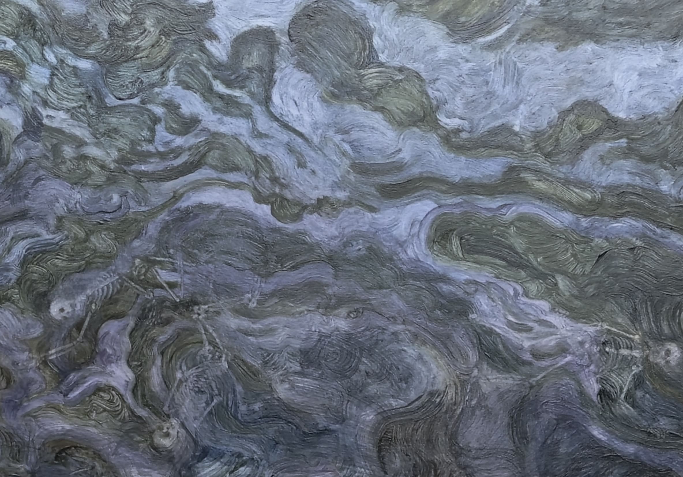 A stylised wave contains tumbling skeletons, while silent ships drift by on the horizon.